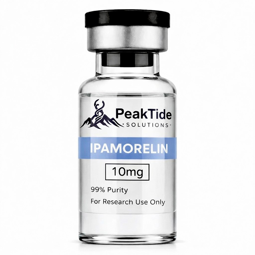 Ipamorelin supplied by PeakTide Solutions is provided as a lyophilized compound powder intended for use in controlled laboratory research environments.