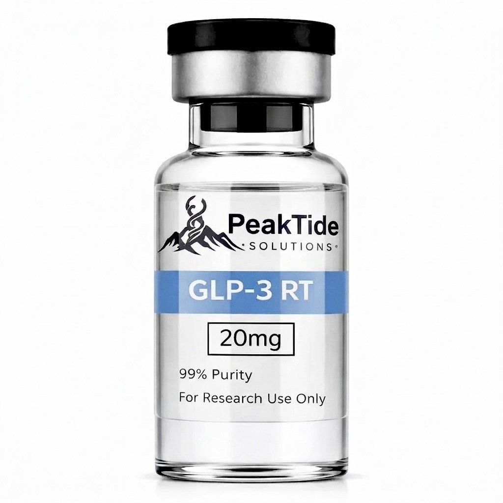 Retatrutide supplied by PeakTide Solutions is provided as a lyophilized compound powder for use in controlled laboratory environments studying compound stability, receptor interactions, and biochemical signaling activity.